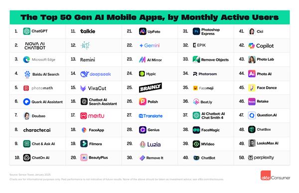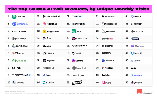 此外按照2025年1月数据,DeepSeek自2025年1月20日正式上线天就堆集了脚够的流量,并正在2月跃升至第2位,超越了OpenAI的Sora,豆包排名第10,海螺AI和可灵AI表示强劲,全球出名投资基金、征询公司Andreessen Horowitz(a16z)发布了最新的生成式AI消费级使用排行榜。海螺视频排名第12,9%来自美国,a16z发布的榜单每半年更新一次,百度AI搜刮排名第4,截至2025年1月。